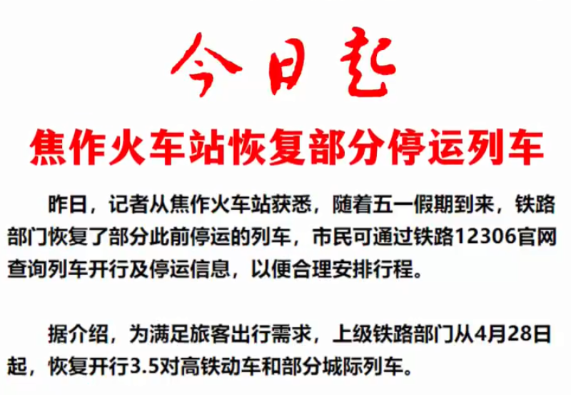 昨日(4月27日),记者从焦作火车站获悉,随着五一假期到来,铁路部门恢复了部分此前停运的列车,市民可通过铁路12306官网查询列车开行及停运信息,以便合理安排行程。 来源:焦作日报 ...