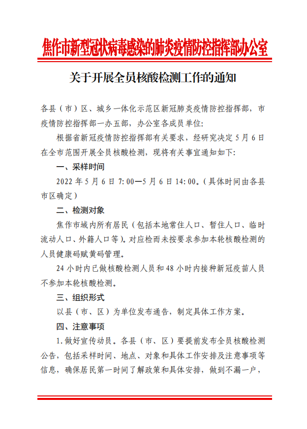 记者从市疫情防控指挥部办公室获悉,根据省新冠疫情防控指挥部有关要求,经研究决定,5月6日,我市将在全市范围开展新一轮的全员核酸检测。 据了解,此次核酸检测的对象为,焦作市域内所有居民(包括本地常住人口、 ...