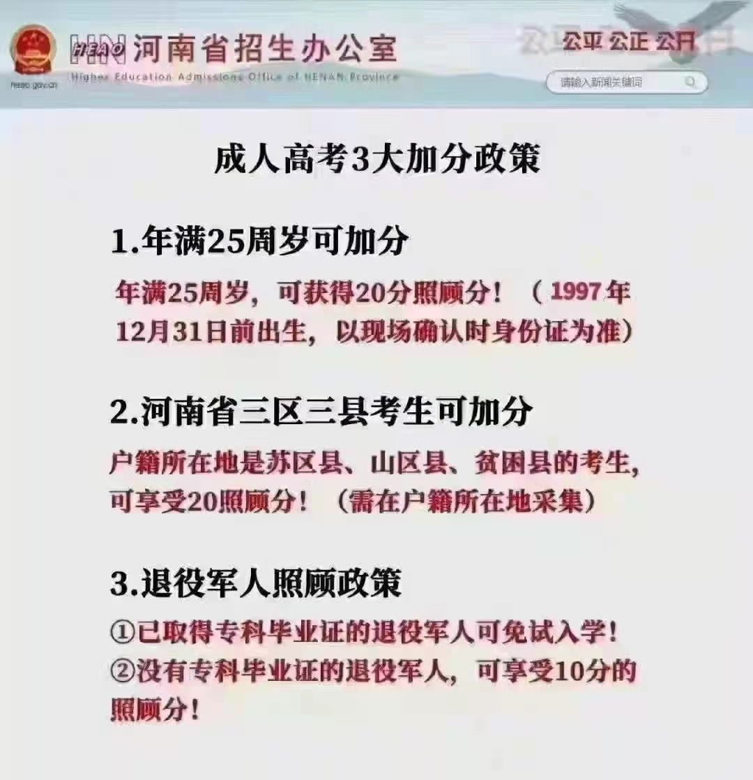河南成人高考加分政策来了 1、年满25岁➕20分 2、退伍军人报本科《免试》入学 3、户籍地为河南贫困县➕20分 政策这么好,别怕考不过,就怕你不报! 19939178924 董老师 ...