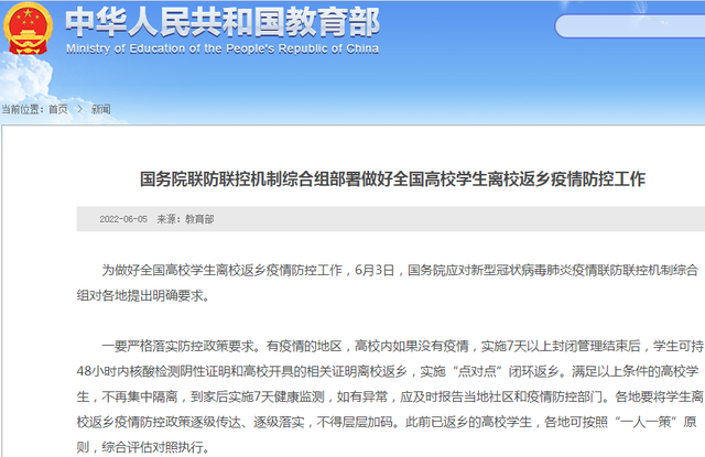 据教育部网站6月5日消息,为做好全国高校学生离校返乡疫情防控工作,6月3日,国务院应对新型冠状病毒肺炎疫情联防联控机制综合组对各地提出明确要求。 一要严格落实防控政策要求。有疫情的地区,高校内如果没有疫 ...