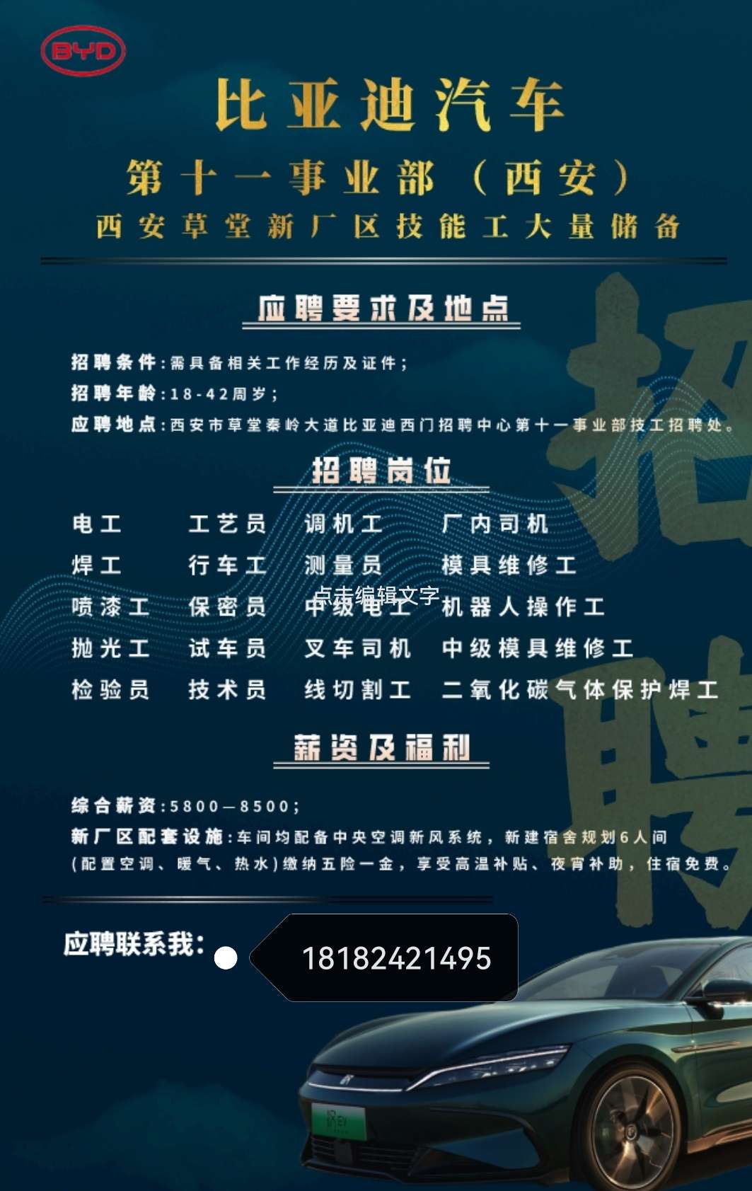 【招聘】 西安比亚迪 男女不限,正式工,企业缴纳五险,饭补每月150,住宿免费,男16-49岁,女16-45岁,招聘截止到8.15号之前入职的企业分月每人奖励累计3000元,月综合工资6000+ 报名电话同微信:18182421495 ...