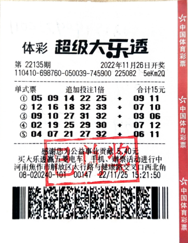 万众瞩目的世界杯激战正酣,竞猜型彩票销售火爆,乐透型体彩同样不甘落后。11月26日,超级大乐透第22135期开奖,位于焦作市解放区太行路与健康路交叉口的4108020240体彩实体店传来喜讯,购彩者王大爷(化名)凭借一 ...
