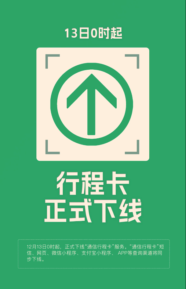 据“通信行程卡”公众号消息,为深入贯彻党中央、国务院关于进一步优化新冠肺炎疫情防控措施,科学精准做好防控工作的决策部署,根据国务院联防联控机制综合组有关要求,12月13日0时起,正式下线“通信行程卡” ...