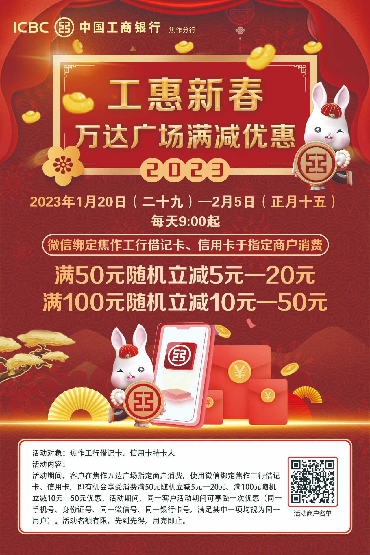 工惠新春万达广场满减优惠 满50元随机立减5-10元 满100元随机立减10-50元 2023年1月20日~2月5日每天9点起 活动对象:焦作工行借记卡、信用卡持卡人 活动内容:活动期间,客户在焦作万达广场指定商户消费,使用微 ...