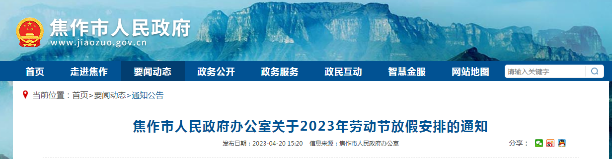 各县(市、区)人民政府,市城乡一体化示范区管委会,市人民政府各部门,各有关单位: 根据《河南省人民政府办公厅关于2023年劳动节放假安排的通知》精神,为便于各县(市、区)、各单位及早合理安排工作,现将 ...
