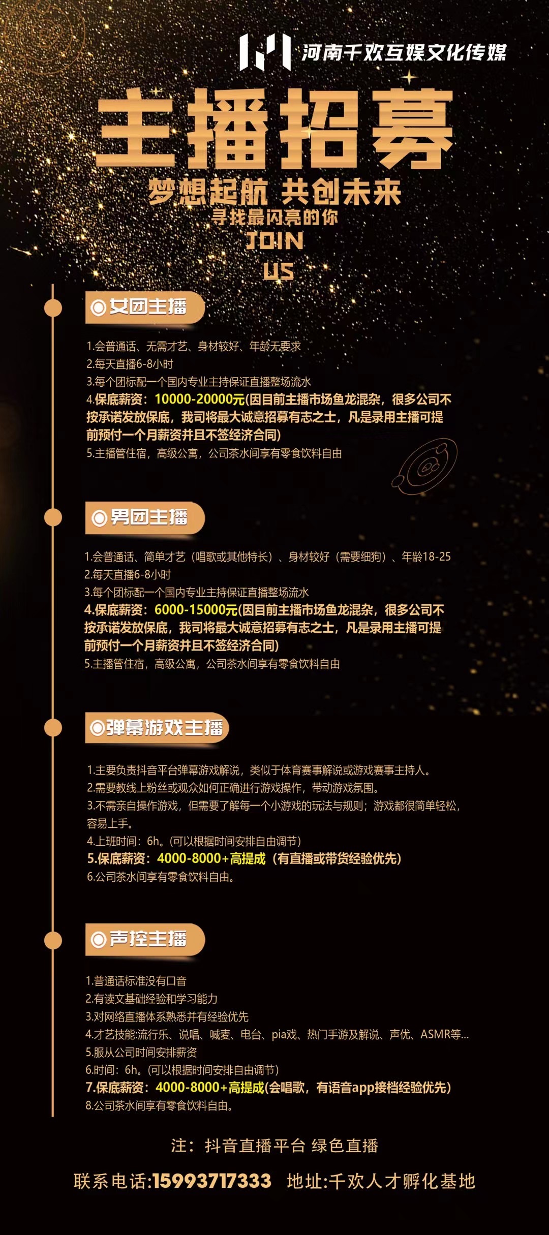 河南千欢互娱文化传媒主播招募!寻找闪亮的你!