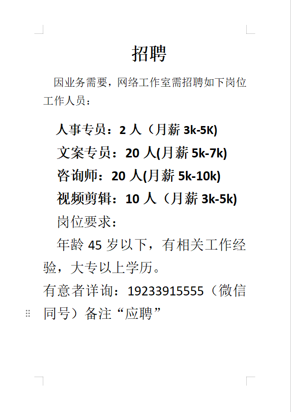 招聘网络客服人员20人