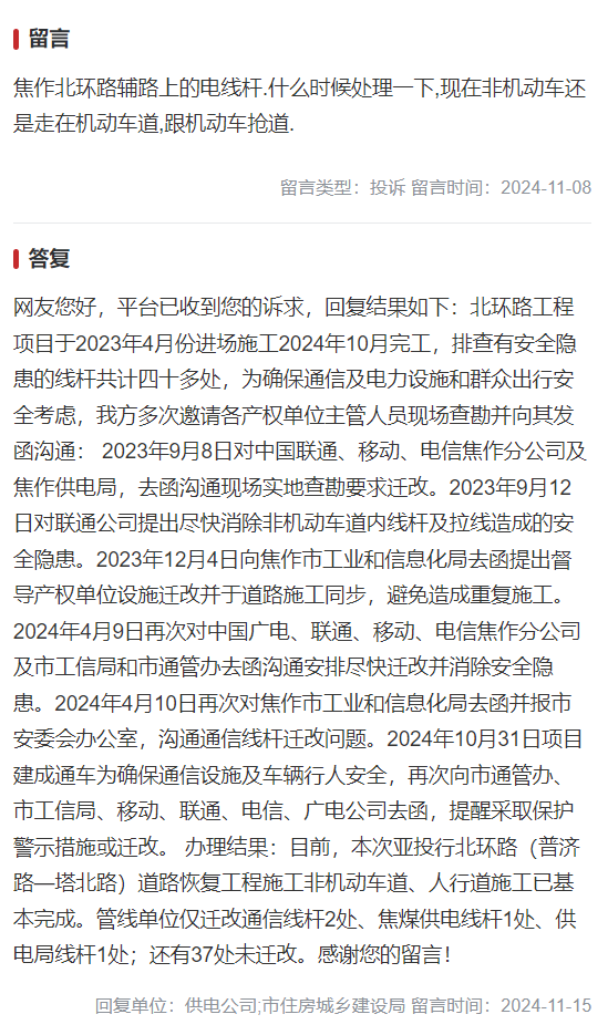 焦作市区北环路新修路段电线杆问题