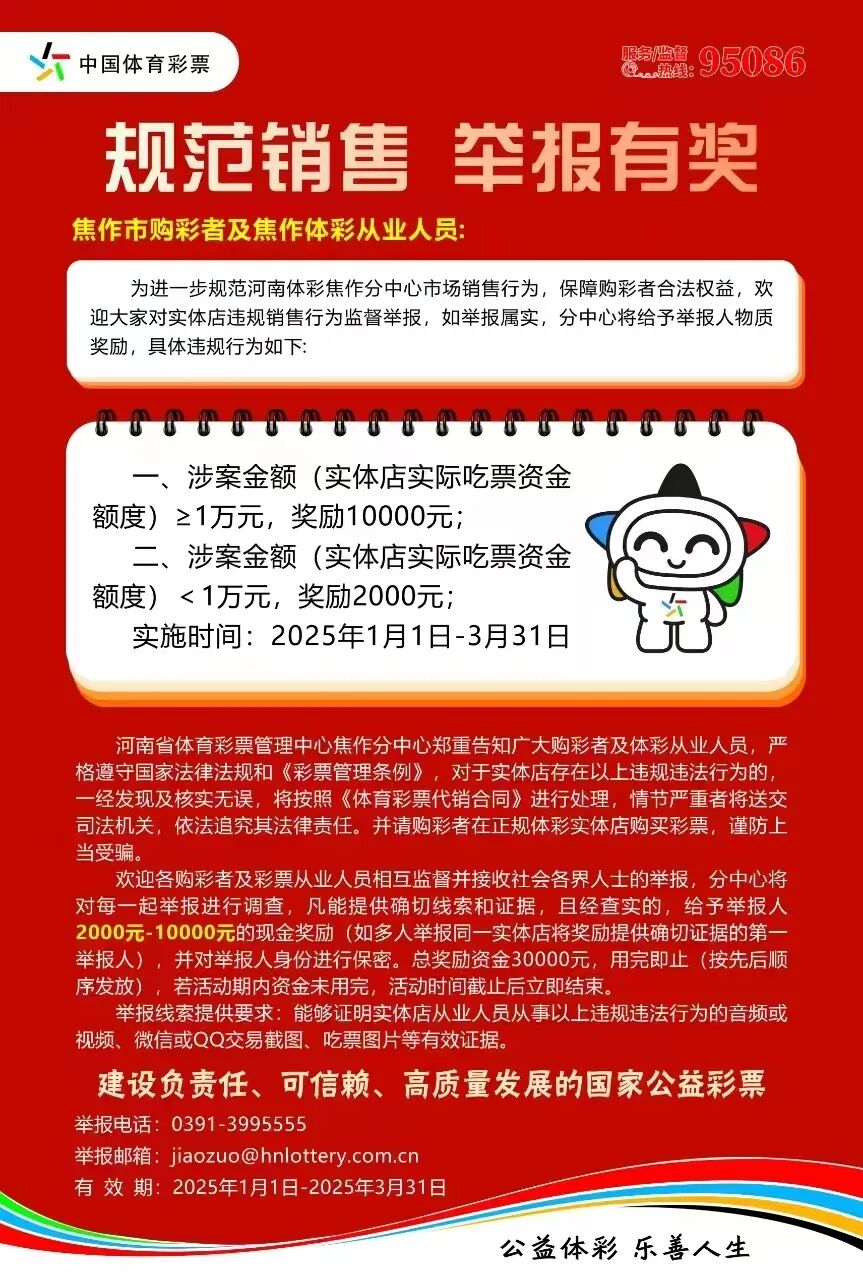 焦作市购彩者及焦作体彩从业人员: 为进一步规范河南体彩焦作分中心市场销售行为,保障购彩者合法权益,欢迎大家对实体店违规销售行为监督举报,如举报属实,分中心将给予举报人物质奖励,具体违规行为如下: 一、 ...