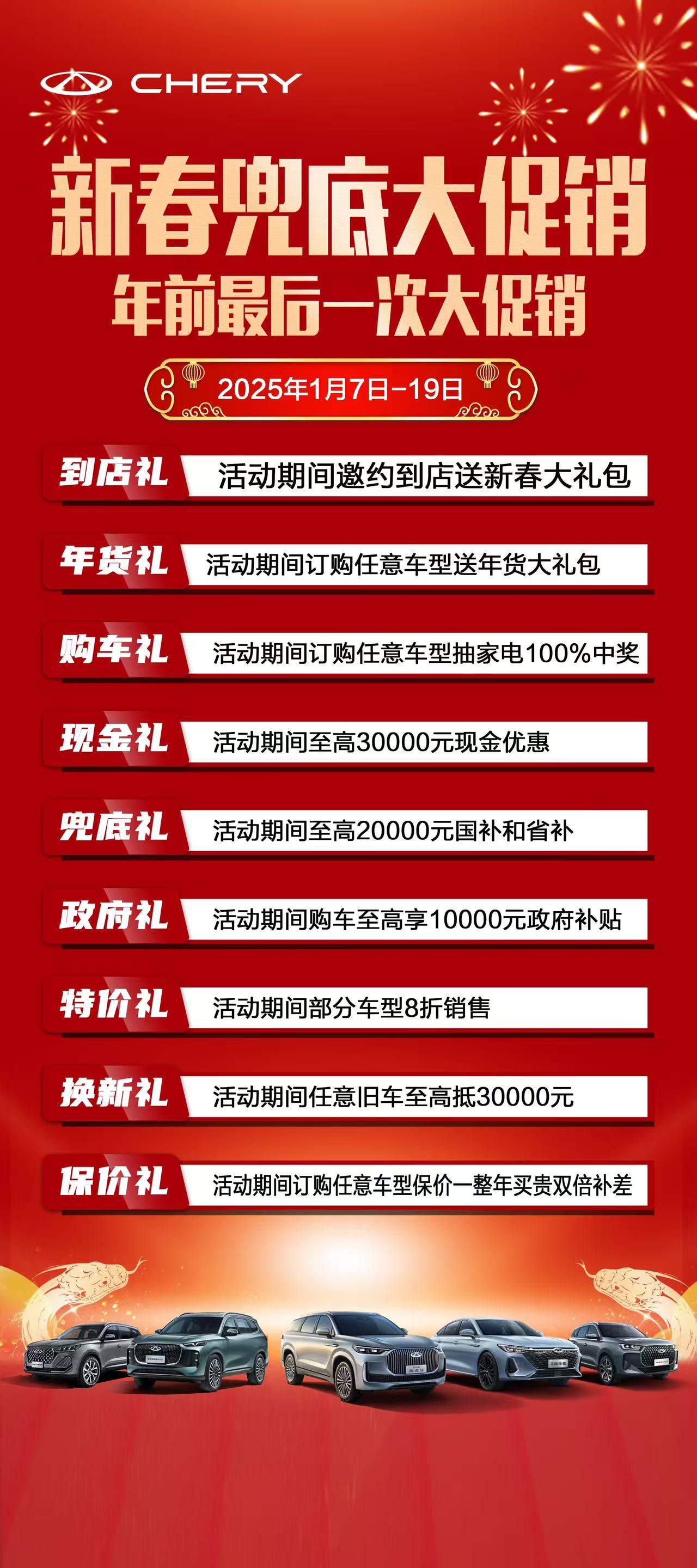 【焦】新春兜底大促销 【作】2025年1月7日-19日 【奇】年前最后一次大促销 【瑞】新春年货拿到手软 【汽】部分特价车8折销售 【车】 0391-3912666 ...
