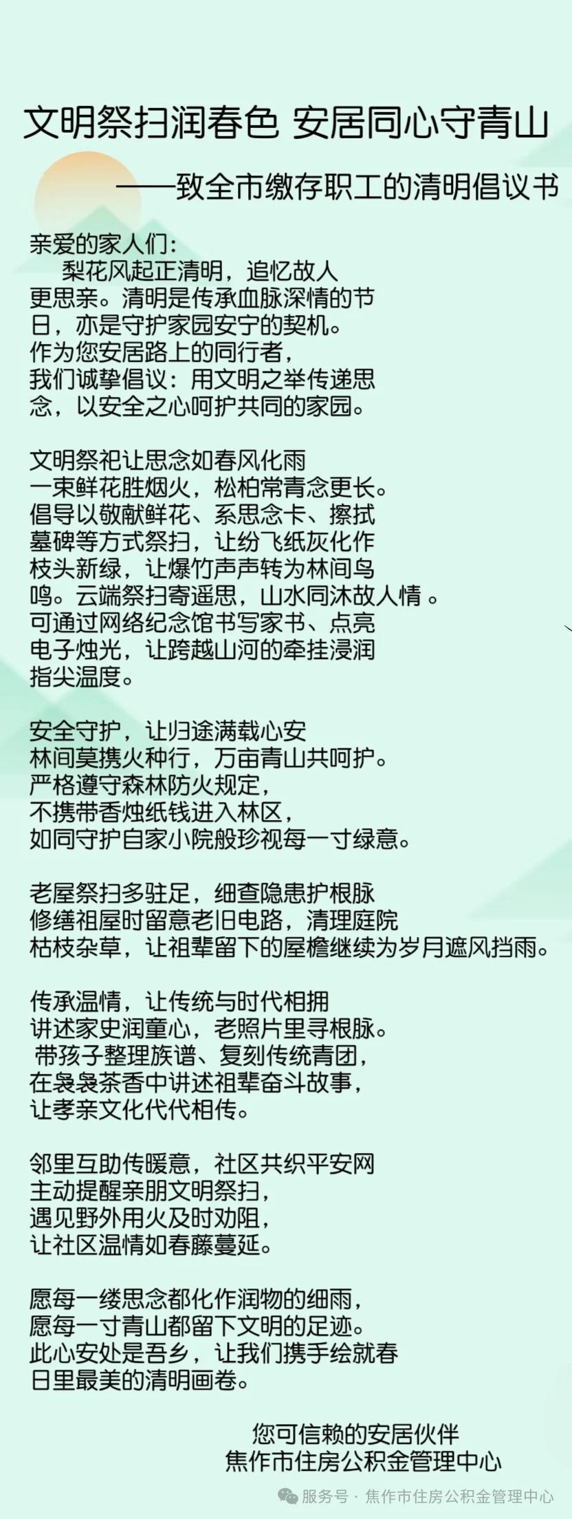 文明祭扫润春色 安居同心守青山——致焦作全市缴存职工的清明倡议书